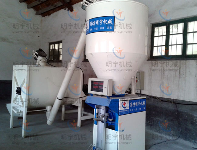 该设备主要由加料斗、螺旋上料机、卧式无重力搅拌机、成品输送机、成品仓、自动称量包装机、电控箱、除尘器(选配)组成。